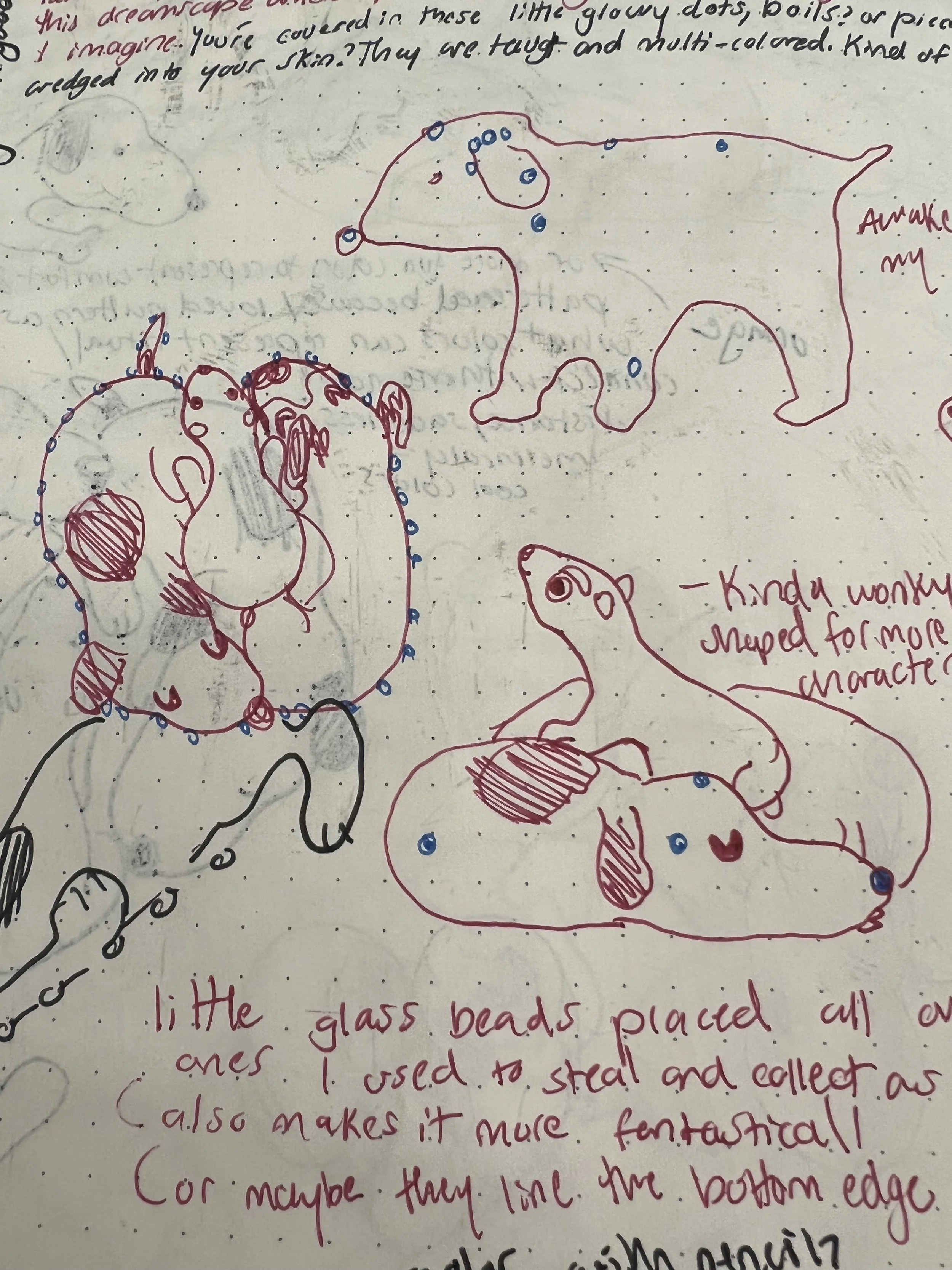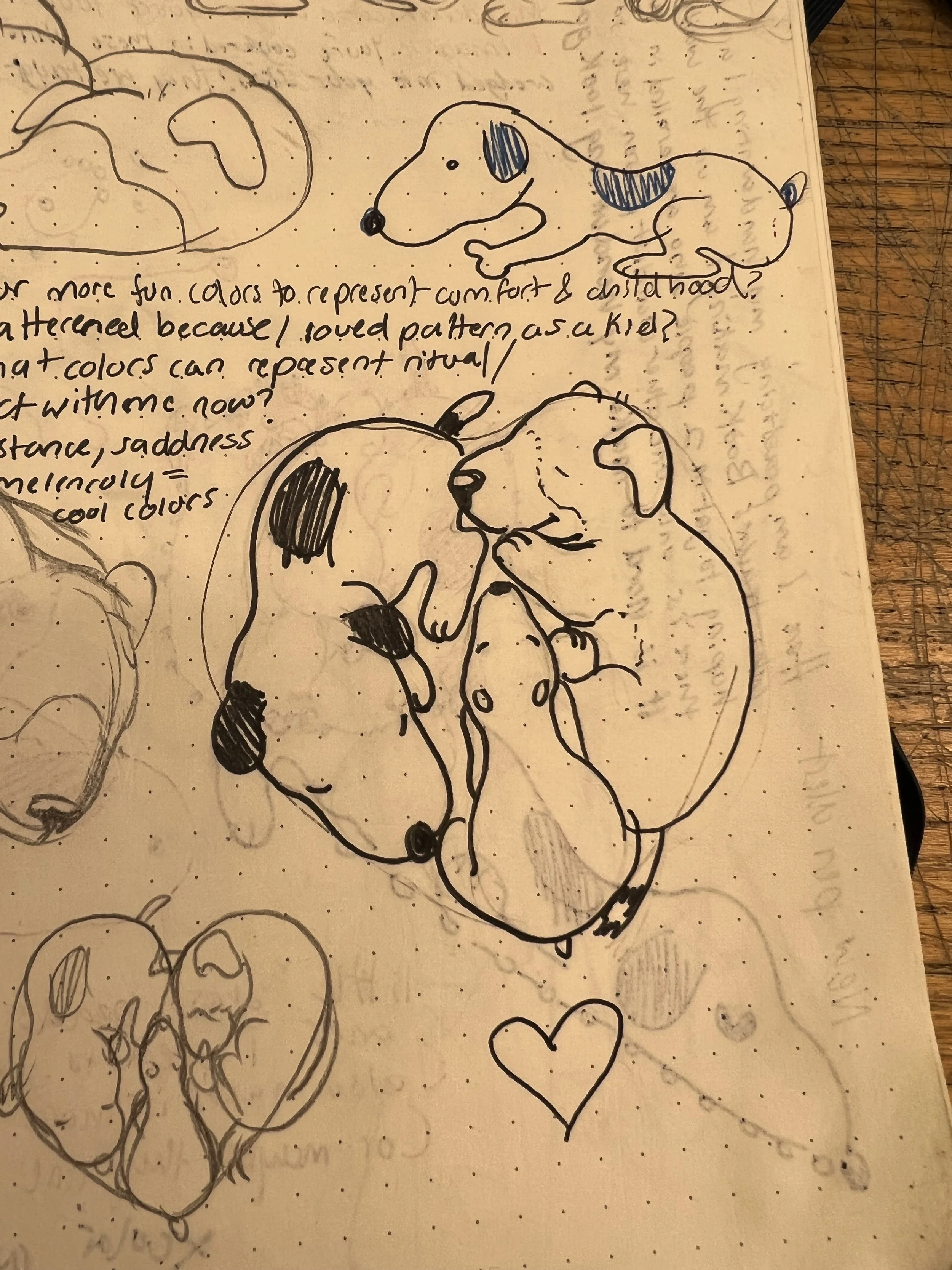 This piece features Kipper from Kipper and Snoopy from Charlie Brown curled up together with my childhood stuffed animal, Sugarcookie. These three dog-like characters have been a constant for me throughout my childhood, offering a familiar source of comfort, even now. They lay peacefully on a bed of nostalgic pastels.