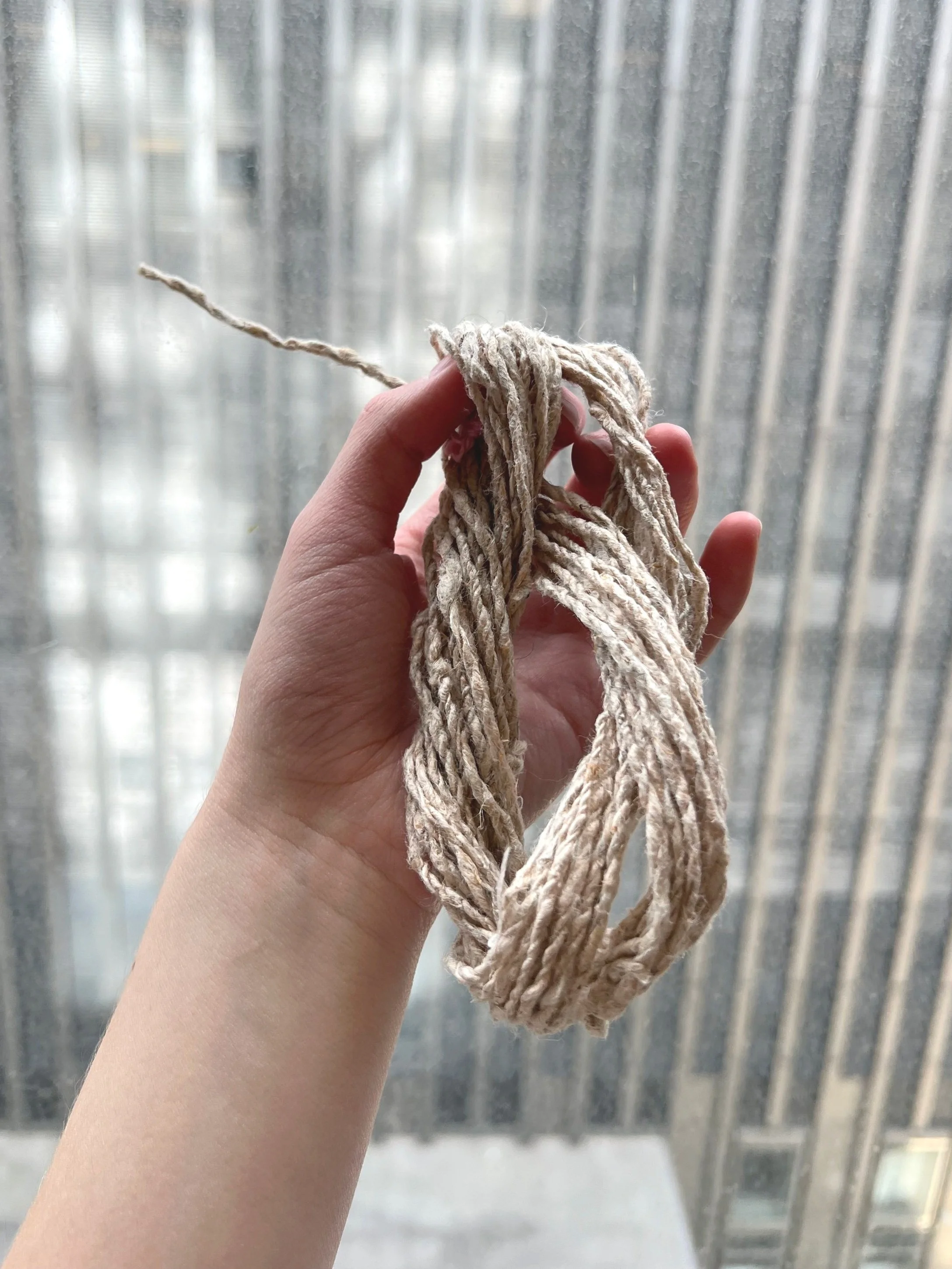 Single-ply bundle then spun into two-ply. Material dip dyed with indigo.