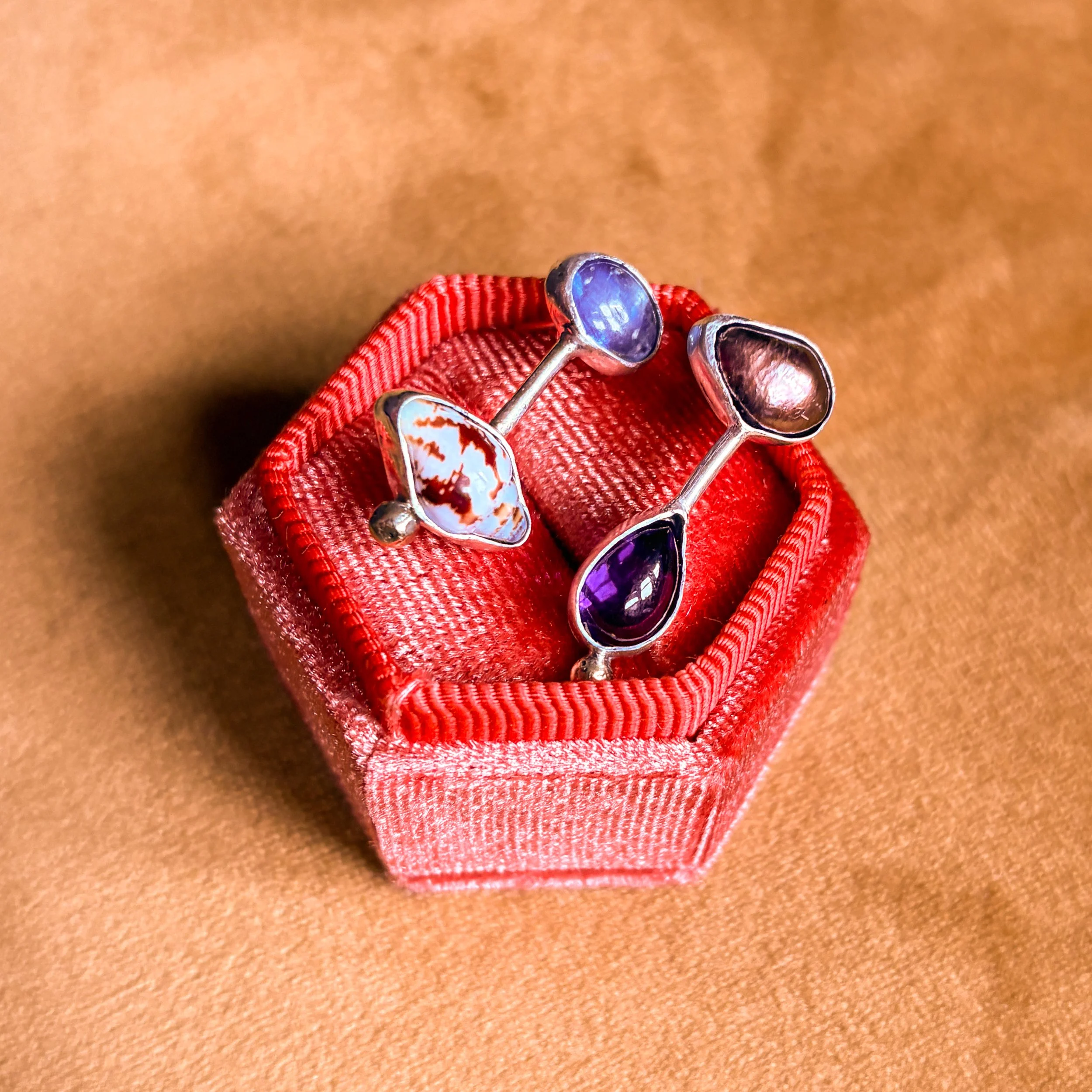 Brown freshwater pearl, Dove Snail shell from a beach in Nice, Amethyst, and Blue Tanzanite.