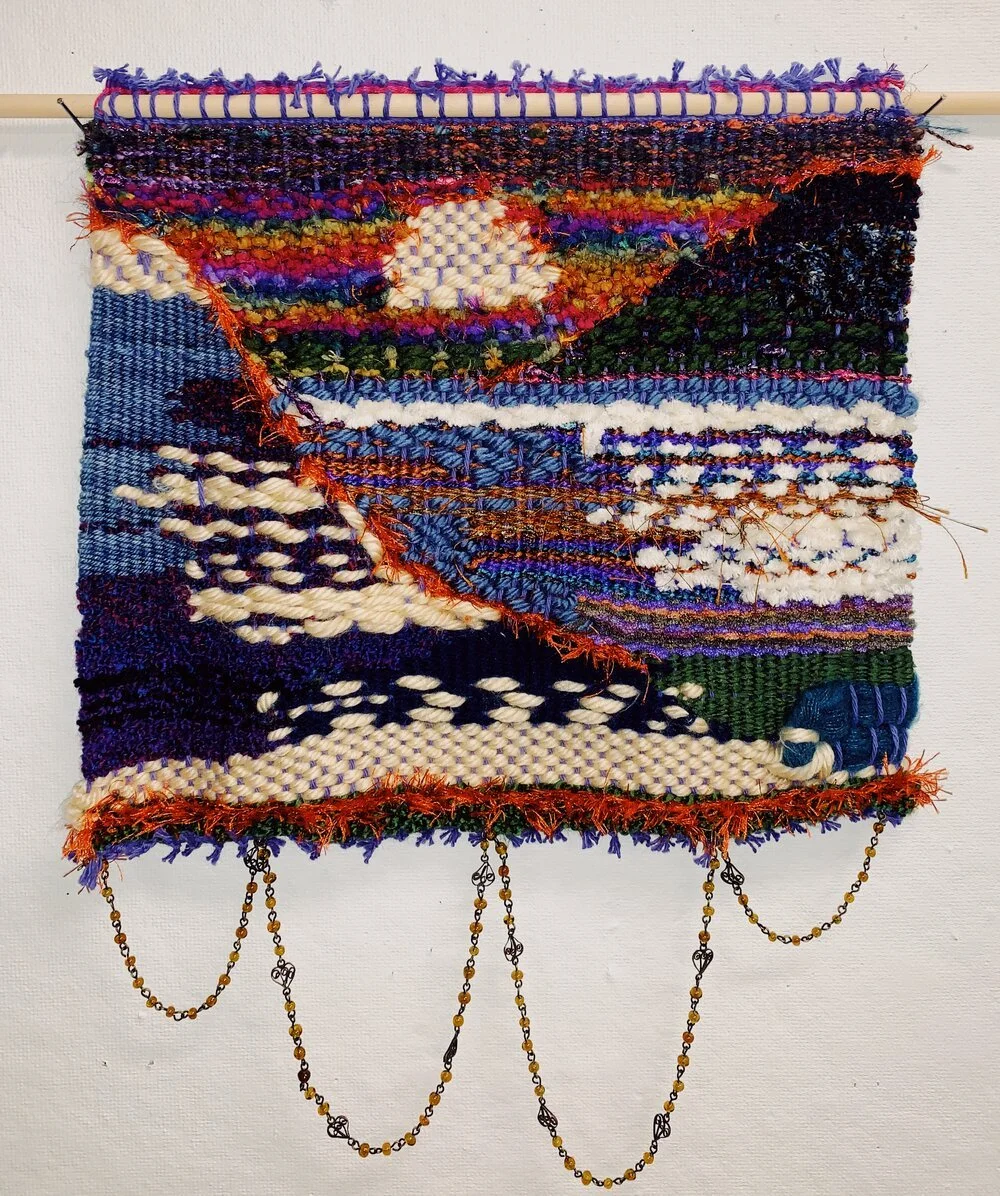 My first weaving explores the channeling of the subconscious, working from intuition and texture rather than reference. Using a handmade 20” x 20” frame loom, this piece is almost completely made up of secondhand materials.